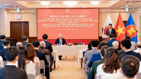 Trong khuôn khổ chuyến công tác tại Nhật Bản ngày 27/7/2025, đoàn đại biểu cấp cao do đồng chí Đỗ Văn Chiến – Ủy viên Bộ Chính trị, Bí thư Trung ương Đảng, Chủ tịch Ủy ban Trung ương Mặt trận Tổ quốc Việt Nam dẫn đầu, đã có buổi gặp gỡ thân mật với cán bộ Đại sứ quán Việt Nam và đại diện cộng đồng người Việt Nam tại Nhật.
