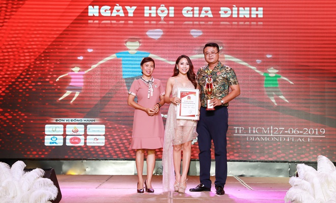 Hoạt động có sự tham gia của nhiều gia đình doanh nhân khác, gia đình Hoa hậu Cộng đồng (áo dài đỏ) Ngân Hà cũng nhận cúp và bằng vinh danh