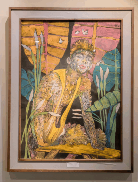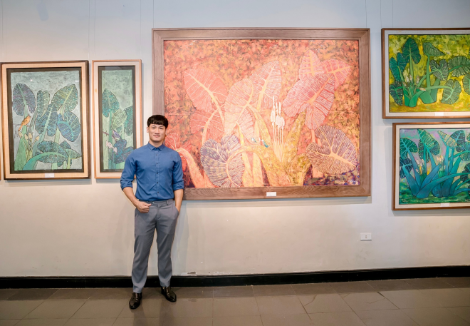 Với những tác phẩm về Hoa dọc mùng thì chiếc lông công hiện lên trong từng chiếc lá, không phải để làm đẹp, mà để tôn vinh như một phần thưởng thầm lặng cho sự kiên cường không tên. “Có những ngày tôi thấy mình trong đó”, họa sĩ Dương Xuân Quyền chia sẻ.
