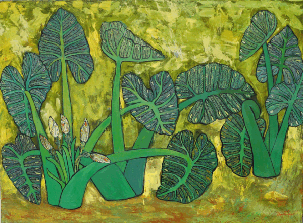 Ở loạt tranh Hoa dọc mùng, họa sĩ Dương Xuân Quyền chọn một loài cây dân dã làm trung tâm sáng tác. Không rực rỡ như sen, như cúc, dọc mùng có vẻ đẹp riêng âm thầm, bền bỉ, sống nơi ẩm thấp nhưng vẫn vươn lên, bung nở.