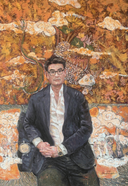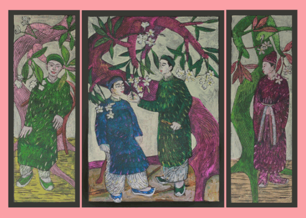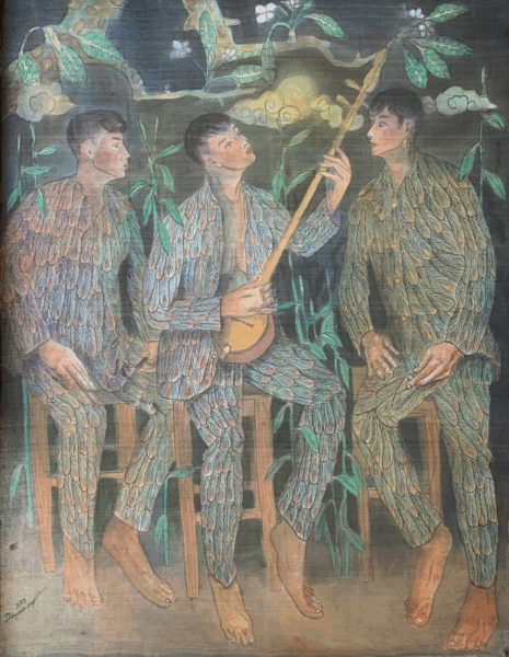 Còn với nhóm Tranh cổ xưa, họa sĩ Dương Xuân Quyền không cố gắng phục dựng quá khứ một cách rập khuôn, mà như đang “lắng nghe những âm thanh từ quá khứ”, rồi từ đó tái hiện chúng qua y phục, họa tiết, dáng ngồi, dáng đứng, những hình ảnh gợi nhớ mà không cần gọi tên.
