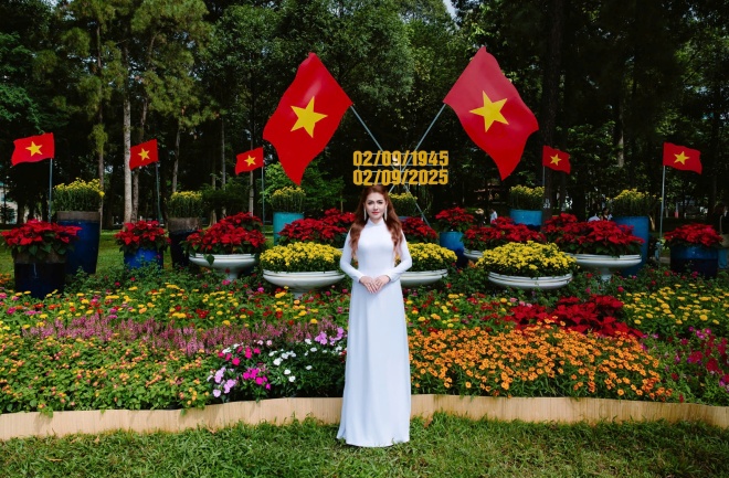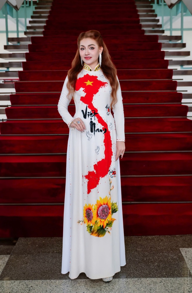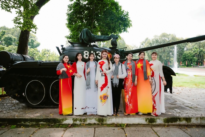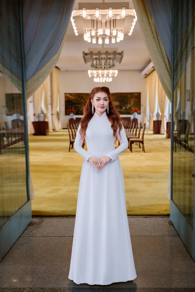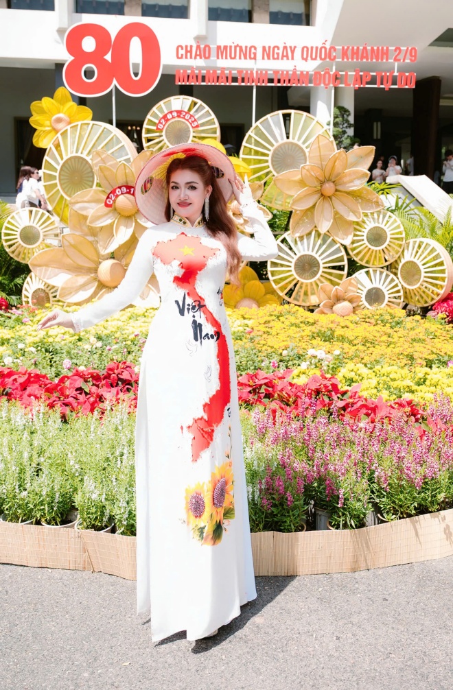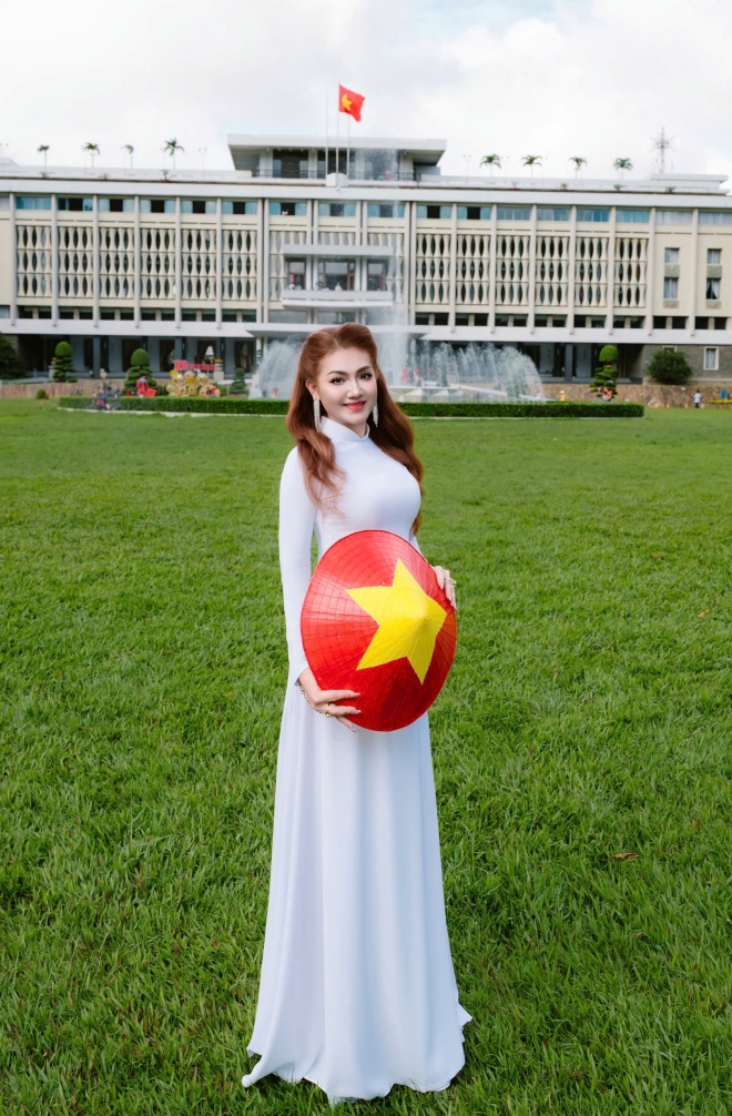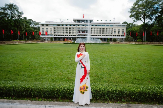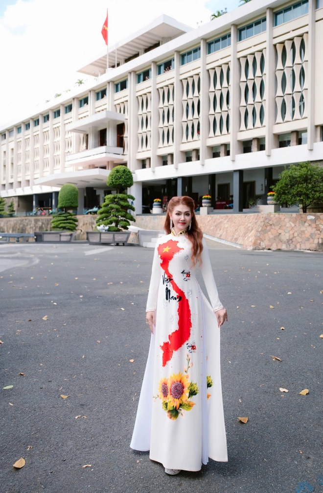 Hòa mình trong không khí cả nước hướng về đại lễ kỷ niệm 80 năm Quốc Khánh 2/9, Nữ hoàng doanh nhân Huỳnh Thị Tuyết Mai đã chọn Dinh Độc Lập làm điểm để ghi lại khoảnh khắc đẹp với 2 bộ áo dài màu trắng và áo dài có hình bản đồ Việt Nam, góp phần lan tỏa tinh thần yêu nước.