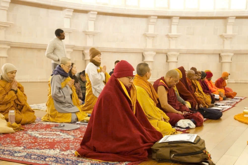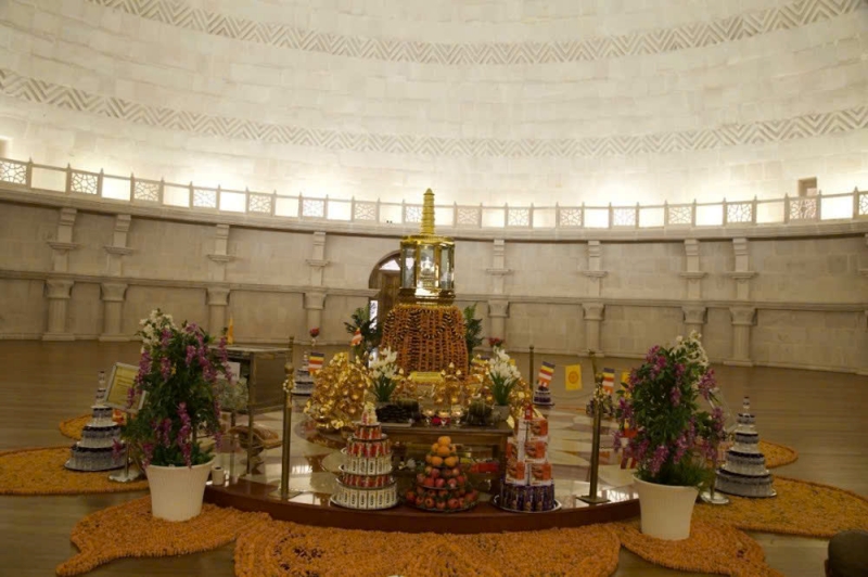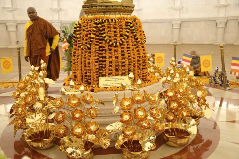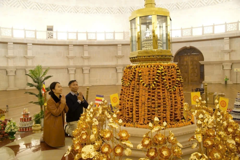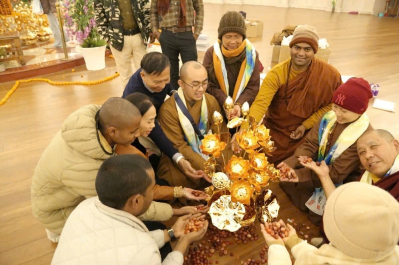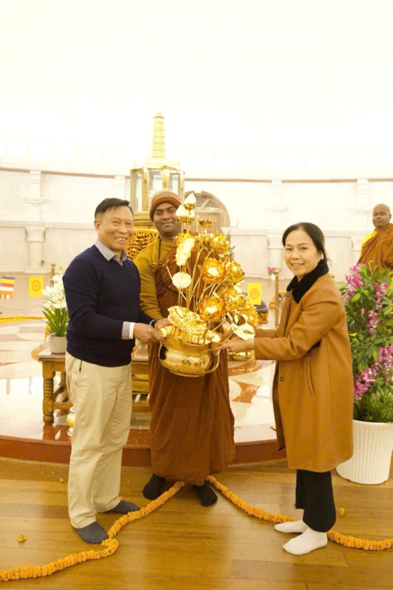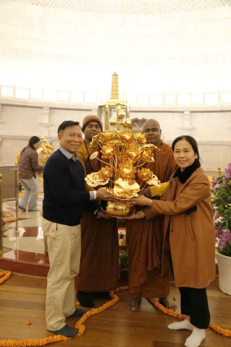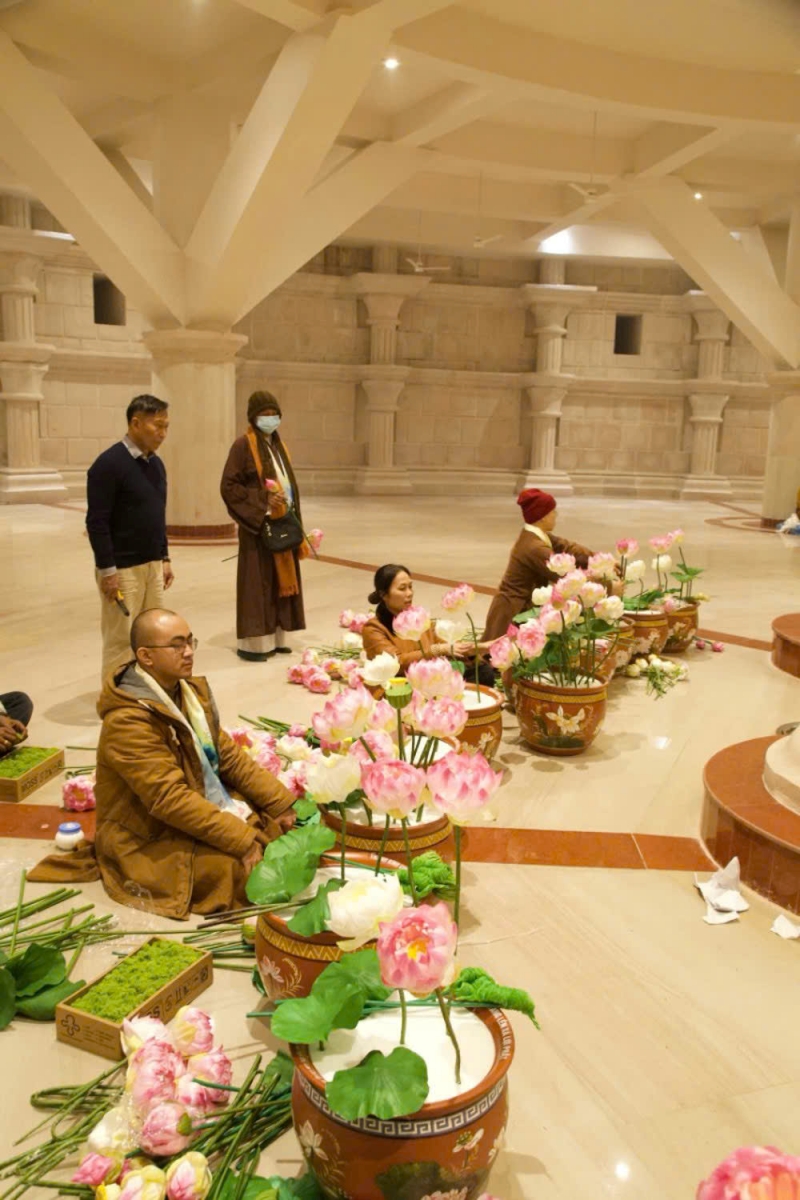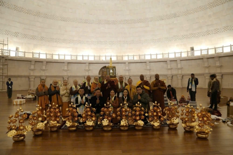 Ngày 7/1/2026 (nhằm 19/11 năm Ất Tỵ), tại khu vực tháp Xá lợi Vaishali, đoàn hành hương đã trang nghiêm tổ chức lễ an vị 12 đóa hoa sen bằng đồng mạ vàng 24K quanh chân tháp. Buổi lễ diễn ra trong không khí thanh tịnh, đúng nghi thức Phật giáo và tuân thủ các quy định bảo tồn di tích của phía Ấn Độ.