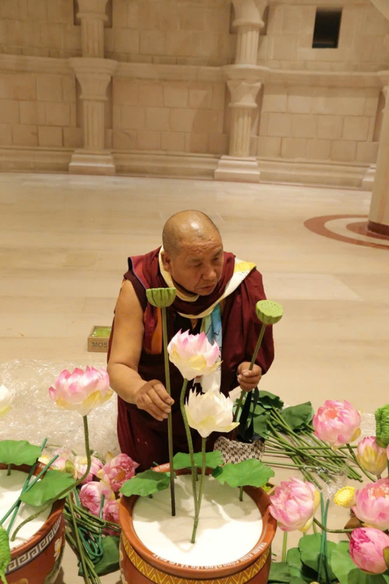 Buổi an vị có sự tham dự của chư Tăng Ni trong đoàn hành hương, 4 vị Pante quản tháp Vaishali, cùng khoảng 350 nhân viên bảo vệ và lao công địa phương. Các đóa sen đồng được sắp đặt hài hòa, trang nghiêm, tạo điểm nhấn mỹ thuật và tâm linh quanh khu vực tháp Xá lợi.