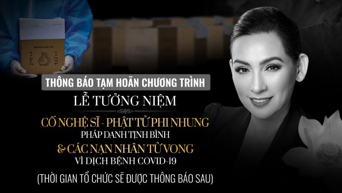 Theo như thông báo ban đầu từ Ban tổ chức, Lễ tưởng niệm Cố nghệ sĩ Phi Nhung sẽ được tổ chức vào ngày 4/10/2021. Tuy nhiên, Ban Tổ chức đã thông báo tạm hoãn sau khi gia đình thực hiện xong các thủ tục cần thiết để chuyển thi hài cố nghệ sĩ Phật tử Phi Nhung sang Hoa Kỳ.