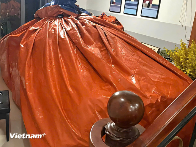 Đáng chú ý, một số người dân còn nghĩ ra cách riêng để bảo vệ tài sản. Anh T.T.N (trú phường Thanh Khê) đã dùng tấm bạt lớn 6×12m phủ kín chiếc xe ô tô của mình, cố định bằng dây với hy vọng chiếc xe có thể “nổi” khi nước tràn vào nhà. Anh cho biết, cách làm này tuy thủ công nhưng có thể giúp hạn chế nước xâm nhập vào khoang động cơ.