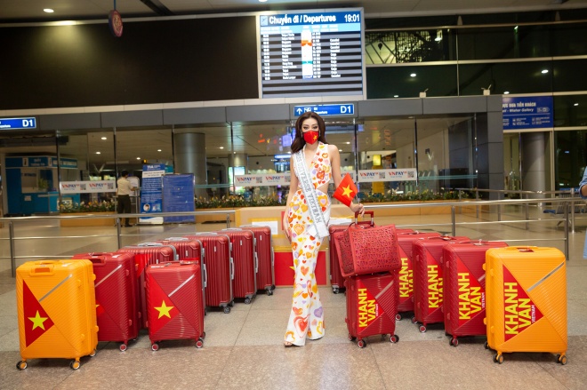 Tại sân bay, Khánh Vân tuân thủ theo các quy định về phòng chống dịch Covid-19, đeo khẩu trang và hạn chế tụ tập đông người. Cô tiết lộ mang theo 15 vali hành lý, nhưng xin phép được giữ bí mật về số lượng trang phục mang theo. “Vân sẽ đem đủ đồ cho 10 ngày thi, còn cụ thể như thế nào, khán giả sẽ được biết khi Vân diện lên người” – cô chia sẻ. Vali Degree đồng hành cùng Khánh Vân trên hành trình đến Mỹ, gồm màu đỏ chủ đạo và màu cam.
